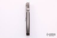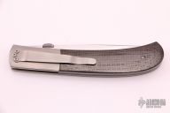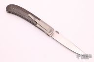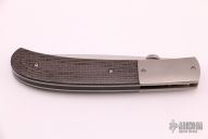 This liner lock folder by John W Smith features a hand rubbed satin finish blade with thumbdisc and notched thumbrest. Bead blasted and dovetailed titanium bolsters and liners, carbon fiber scales, black linen micarta backspace, tip down titanium clip. Strong lock up, nice detent and blade seating. Has a few light scuffs/scratches, otherwise excellent condition.