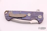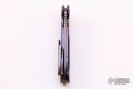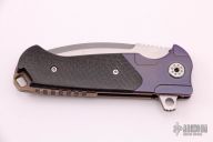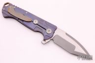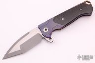 This ADV Ronin Prototype framelock flipper has a two-tone finished spear point tanto blade with notched flipper and thumbrest. Handle has an anodized titanium frame with carbon fiber inlay, textured and anodized titanium backspacer and a Super Conductor tip up clip. Nice smooth action, detent, lockup and blade seating. Comes with a zippered case. Has a few light scratches, otherwise excellent condition.