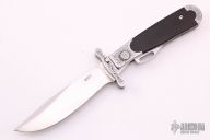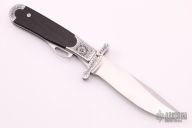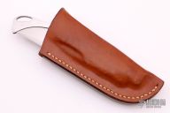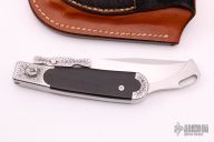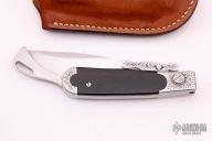 This Swing Guard Safety Folder by AJ Hubbard features a hand rub satin finished blade with false top edge. The handle has stainless steel swing guards and bolsters that have been engraved, wood scales, stainless steel liners and backspacer. Has a folding blade protector that folds into the handle when the blade is open and locks it. Has a few light scratches, otherwise excellent condition. Comes with a brown leather belt sheath.