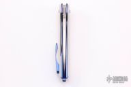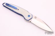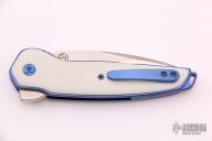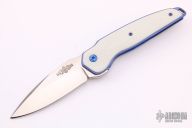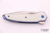 The Supernova is a Faisal Yamin design that was beautifully executed by Les Voorhies. The knife features a satin finished blade with flipper. Liners, pocket clip, and backspacer are blue anodized titanium to match the hardware, white G-10 scales. Blade is centered when closed, flips with very smooth action, nice detent and lockup. Comes with original box and papers dated 7/5/14. Excellent condition.