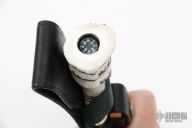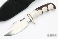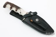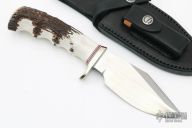 This knife has a satin finished stainless steel blade, with sharpened top edge, .231" blade stock and 1.781" depth, hidden tang construction. The handle has nickel silver guard and a stag handle with finger grips, compass in the butt. Comes with black leather sheath. Excellent condition.
