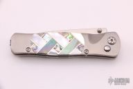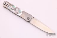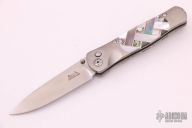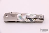 This Tesoro button lock folder by Santa Fe Stoneworks features a satin finished blade with single thumbstud. The handle has a satin finished titanium frame with mosaic pearl inlays and a tip up stainless steel clip. Comes with original box and papers. Excellent condition.
