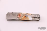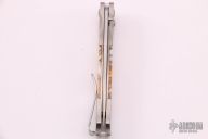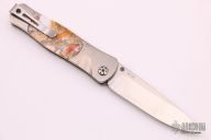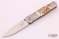 This Tesoro button lock folder by Santa Fe Stoneworks features a satin finished blade with single thumbstud. The handle has a satin finished titanium frame with spiney oyster inlays and a tip up stainless steel clip. Comes with original box and papers. Excellent condition.