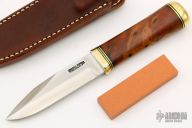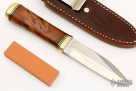This Gambler by Randall Made Knives features a satin finished blade with .170" blade stock and .950" blade depth, hidden tang construction. Sharpened top edge. Notched thumbrest. Thuya burl wood grip with brass guard and butt, black/brass spacers. The Gambler is one of Randall's non-catalog knives. Brown leather sheath. Excellent condition. Comes with original paper wrapping and sharpening stone.