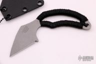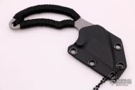 This Moon's Kiss Neck Knife with Skull has a tumbled chisel ground wharncliffe blade with thumb rest and hidden tang.  120" Blade Stock.  1.21" Blade Depth. The handle has a cord wrapped skeletonized frame.  Comes with kydex sheath with a bead chain necklace.  New from maker!