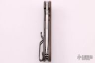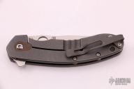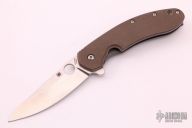 This Southard framelock flipper by Spyderco Knives features a tumbled blade with a notched thumb-rest, thumb-hole, and flipper. The handle has a textured earth G-10 scale with a bead blasted titanium liner and titanium scale with brown G-10 around the pivot screw and a stainless steel clip, tip up carry. Includes the original box. Has some light scratches, otherwise excellent condition.