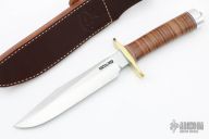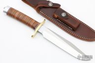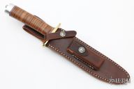 This Model 1-7 from Randall Made Knives features a satin finished clip point blade with sharpened top edge, .196" blade stock and 1.240" blade depth, hidden tang construction. The handle is comprised of a brass guard, red/white/blue spacers, stacked leather handle and duralumin pommel. Comes with brown leather sheath and original paper wrapping. Excellent/new condition.