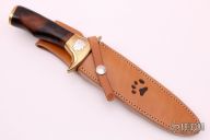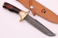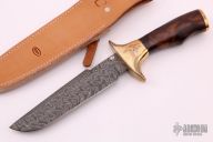 This Light Fighter by TC Roberts features a Chad Nichols Stainless Damascus blade with false top edge, .190" blade stock and 1.511" blade depth, hidden tang construction. The handle has a bronze guard with engraved copper and silver inlays, desert ironwood burl grip, bronze butt engraved with "12/13", "Lion" and a Lion paw. Dated 2020 on the guard. Comes with a hand tooled brown leather sheath made by Parsons. Excellent condition. Comes with a zippered case.