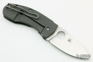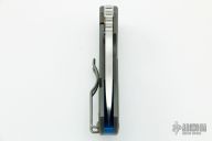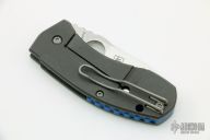This Techno from Spyderco features a tumble finish blade with thumb hole. Tumble finish titanium frame with notched blue G-10 backspacer. Comes with original box and papers. This model is now discontinued. Excellent Condition.