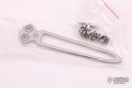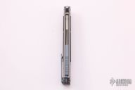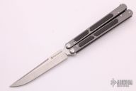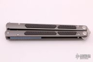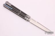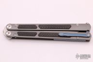 This Balisong by Maxace Knives features a satin finished clip point blade with false top edge. The handle has blasted titanium handles with carbon fiber inlays, anodized titanium backspacers, tip up clip and T-latch. Comes with original box, zippered case with trainer blade and extra hardware. Has a couple light scuffs, otherwise excellent condition.