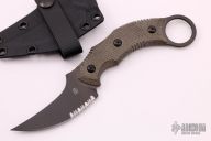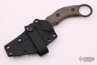 This Mako from Bastinelli Knives features a black upswept blade with swedge, .119" blade stock and 1.367" blade depth, mortis tang construction. The handle has a green micarta scales with a one inch finger hole on pommel. Includes kydex sheath and a padded zippered case. New from maker.