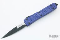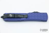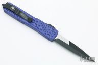 This Ultratech OTF automatic features a bayonet grind black/satin double edge blade with a plain edge and a purple anodized Tri-Grip aluminum handle. Black stainless steel clip tip down. Glass breaker. Serial number 63942 and dated 10/2016. Comes with original box and papers. Excellent condition.