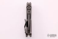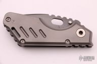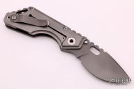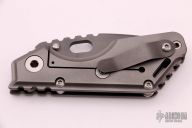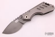 This Stub by Mick Strider features a gray blade, notched thumbrest and a thumbhole. The handle has a grey finished titanium frame with a tip up pocket clip. Nice detent, lockup and blade seating. Marked "M. Strider" under choil. Has a couple light scuffs/scratches, otherwise excellent condition.