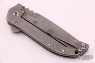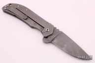 This "Gen 2" El Patron Framelock Flipper has a dark acid washed drop point blade with flipper and notched thumb rest. Handle is stonewashed titanium with black micarta A-side overlay, lanyard hole, and stonewashed titanium tip up clip. Flips exceptionally well on bearings, rock solid lockup, and dead center blade seating. Very well made piece. Blade shows some wear, otherwise good condition. Comes with original tube packaging (which is cracked).