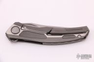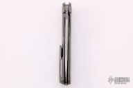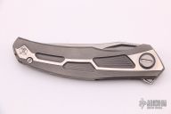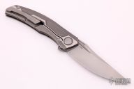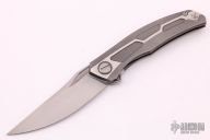 This Quantum Gen2 by Shirogorov features a blasted blade with notched thumbrest and flipper. The handle has a blasted and milled titanium frame, backspacer, tip up titanium clip with hidden screws. Rides on MRBS, nice detent, lockup and blade seating. Comes with original box and COA. Excellent condition.