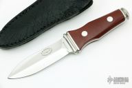 This is a very attractive boot knife from AG Russell. This is the older model made in Solingen, Germany. Blade is .103" thick and .916" deep at the ricasso and double-edged. Scales are red linen micarta. Integral construction with aluminum pins. Comes with black leather sheath with clip. Has a few very light scratches, otherwise excellent condition.