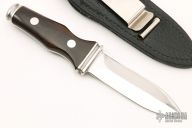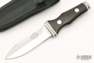 This is a very attractive boot knife from AG Russell. This is the older model made in Solingen, Germany. Blade is .103" thick and .916" deep at the ricasso and double-edged. Scales are black linen micarta. Integral construction with aluminum pins. Comes with black leather sheath with clip. Has a few very light scratches, otherwise excellent condition.