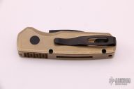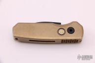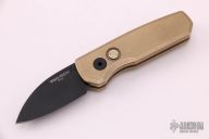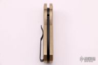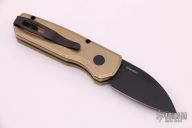 This Runt 5 by Pro-Tech features a black blade.  The handle features a stonewashed bronze aluminum frame with milled thumbrest, a stainless steel tip up pocket clip and a mosaic push button.  Comes with original box and papers. New from maker.