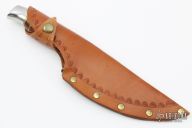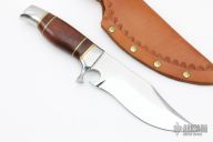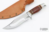 This Bowie by Wayne Whittaker features a mirror polished blade with false top edge and checkered spine, .252" blade stock and 1.808" blade depth, hidden tang construction. The handle has a stainless steel guard and butt, wood grip and brass spacers. Comes with a hand tooled brown leather sheath. Dated 1990. Has some light scratches, otherwise excellent condition.