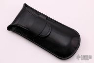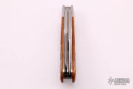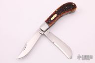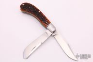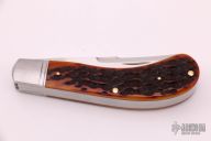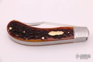 This Model 36B Cowboy Saddle Horn Trapper by Tommy Overeynder features 2 hand rubbed satin finished blades with nail nicks. The handle has 416 stainless steel fluted bolsters with integral liners, stainless steel springs, amber RJB jigged covers with 18k gold pins and escutcheon. Has half-stops and springs are flush at all positions. Comes with a black leather case. Excellent condition. #002