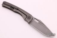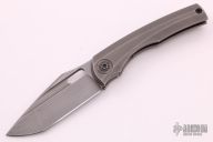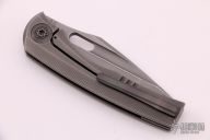 This BBM V2 by Nick Chuprin and Robert Carter features a tumbled blade with fullers, thumbhole and milled bevels. The handle has an Ash Rub finished titanium frame, zirconium pivot, screws and tip up clip with hidden screws, pivot collars and oil slick finished backspacer. Rides on bearings, nice detent, lockup and blade seating. Comes with a zippered case. Excellent condition.