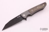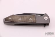 This Sangre Street model has a gray titanium handle with a green canvas micarta inlay. Its blade is made from S35VN steel with a lightly tumbled black finish.