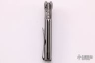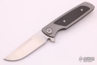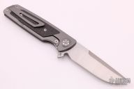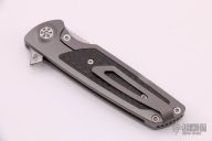This Micro Typhoon flipper from Brian Nadeau/Sharp by Design features a satin finished blade with swedge. The handle features fine bead blasted titanium scales with carbon fiber inlays. Matching titanium pocket clip and backspacer. Blade is centered when closed, flips well with no wrist action needed, and locks up with no play. Knife is in excellent condition, shows no signs of use or carry. Comes with vaulted case.