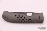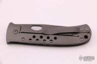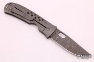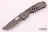 This TNT Framelock by Tom Mayo features a Damascus blade with a thumbhole. The handle has a bead blast titanium frame with titanium tip up clip, all titanium hardware. Smooth action. Nice detent, blade seating and lockup. Comes with zippered case. Has a couple light scratches, otherwise excellent condition.