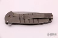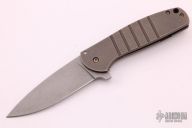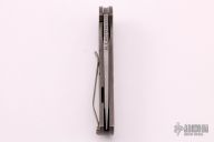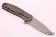 This Jasmine flipper by Ray Laconico features a stonewash finished blade with flipper. The handle has a milled and tumbled titanium frame, black G-10 backspacer and tip up titanium clip, lanyard hole at the butt. Nice detent, lockup and blade seating. Has some scratches, otherwise excellent condition. Comes with a zippered case.