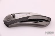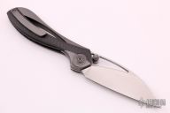The WE Knife Co. Pleroma is another futuristic knife design from Elijah Isham revealed at Blade Show 2018! This model has a bead blasted titanium handle with carbon fiber inlays and a wharncliffe/sheepsfoot blade with dual thumbstuds. It features a curved vertebral integral titanium handle with a single stainless steel liner. Comes with original box and papers, excellent condition.