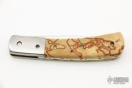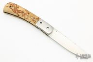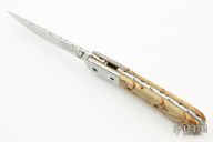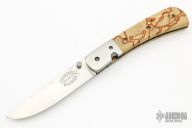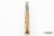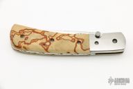 This linerlock by Recatto Custom Knives features a satin finished blade with fileworked spine with a single checkered thumbstud. The handle has dovetailed stainless steel bolsters, spalted wood scales, anodized titanium liners with jeweled interiors, fileworked stainless steel backspacer. Nice detent, lockup and blade seating. Comes with a zippered case. Excellent condition.