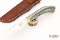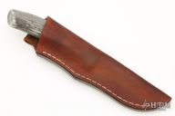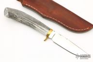 This hunter by Recatto Custom Knives features a satin finished blade with fileworked blade spine, .149" blade stock and .992" blade depth, hidden tang construction. The handle has brass guard, axis deer antler grip. Comes with a brown leather sheath. Excellent condition.