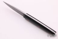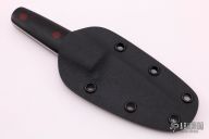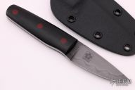 This Fixed Blade by Josh Mason features a two tone blade, satin finished bevels with hamon and forge finish flats, .125" blade stock, .955" blade depth with full tang construction. The handle has black G10 scales, with red pins. Comes with a Kydex sheath. New from maker.