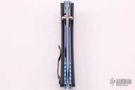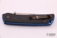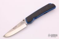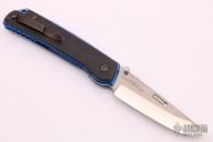 This Higo from Rockstead features a two-tone drop point blade with mirror polished grinds, dual thumb studs and notched thumbrest. The handle is comprised of carbon fiber scales over anodized titanium liners and a single barrel spacer. Lanyard hole in pommel. Includes original box and papers.  Has some light scuffs and scratches, otherwise excellent condition.