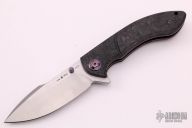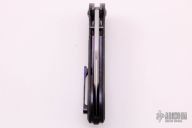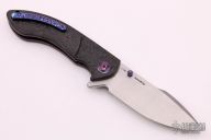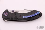 This Eric Ochs designed knife by Massdrop features a satin finished blade with a false top edge and flipper. The handle has marble carbon fiber scales with stippled faux bolsters, anodized titanium hardware, mokuti pivot collars and tip up clip with hidden screws, anodized titanium liners, notched carbon fiber backspacer, lanyard hole. Comes with original box and zippered case. Has some light scuffs and scratches, otherwise excellent condition.