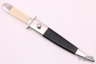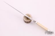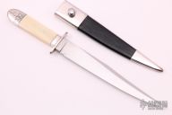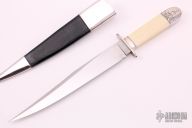 This Bowie by Judson Brennan and Sons features a hand rub satin finished blade with false top edge, .263" blade stock and 1.003" blade depth, hidden tang construction. The blade has sterling silver guard, collar and butt with a walrus ivory grip. The fittings have been engraved adan the spine of the blade is engraved with "Brennan and Sons #25". Comes with a sterling silver and black leather sheath with belt stud. Has a small crack in the handle, otherwise excellent condition. Comes with a zippered case.