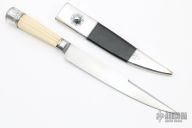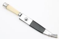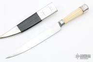 This Reproduction Antique Bowie by Brennan & Sons features a hand rub satin finished blade with .285" blade stock and .948" blade depth, integral bolster hidden tang construction. The handle has engraved integral bolsters, engraved silver butt with an engraved steel tang screw, fluted mammoth ivory grip. Comes with an engraved silver and black leather sheath with belt stud. Excellent condition and a really nice example of an Antique Reproduction. The makers name is hand engraved on the spine of the blade along with "No 31" under the bolster area. Comes with a zippered case.