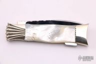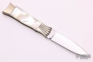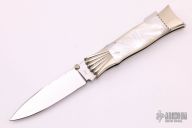 This Lockback by Ken Steigerwalt features a mirror polished blade with fileworked spine and single nickel silver thumbstud. The handle has Ken's classic scalloped nickel silver dovetailed bolsters, mother of pearl scales, nickel silver liners, fileworked stainless steel backspacer. Excellent condition. Very classy little piece. Comes with a zippered case. Dated 2-15-80 inside the backspacer.