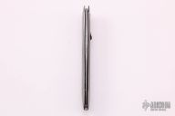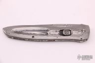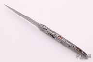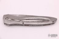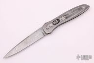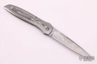 This slide lock by Bill McHenry features a Damascus blade with false top edge. The handle has Damascus scales, Damascus thumbslide, fileworked stainless steel backspacer with tortoise shell inlays. Dated 1997 and #256 inside the backspacer. Nice lockup and blade seating. Comes with a zippered case. Has some light scratches, otherwise excellent condition.
