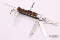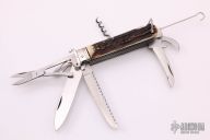 This Multi-Blade folder by Indian Cutlery has satin finished blades with nail nicks and a cork screw. Handle has stainless steel bolsters with 12 and 20 gauge shot shell pullers, brass and stainless steel liners, stainless steel springs. Main blade is a lockback. Has large lanyard bail. Has some light scratches, everything is perfectly functional. Excellent condition for its age.