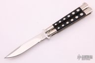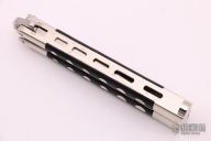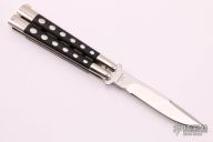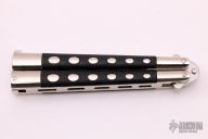 This Balisong by Benchmade features a polished Weehawk blade with false top edge. The handles are nickel silver with black plastic inlays. Comes with original box. Excellent condition.