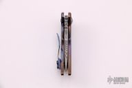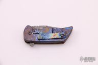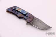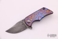 This Tracker Jacker by Jonathan McNees features a Damasteel blade with swedge, notched thumbrest and flipper. The handle is comprised of a mokuti frame over single barrel spacer, mokuti tip up clip. Great blade seating, detent and lock up. Rides on bearings. Excellent condition.