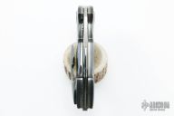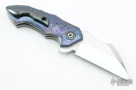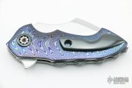 This Variom #4 by Dan Brown features a hand rub satin finished blade with false top edge and a flipper. The handle has Chad Nichols Zircuti scales, zirconium pivot collars, satin finished titanium liner with jeweled interiors, zirconium backspacer with notches and tip up clip with hidden screws. Rides on bearings, nice detent, lockup and blade seating. Comes with a zippered case. Excellent condition.
