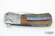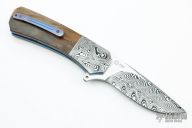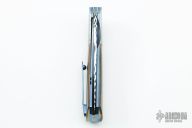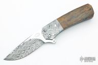 This LL15 linerlock flipper by Herucus Blomerus features a Damasteel blade with polished flats and flipper. The handle has Damasteel bolsters, mammoth ivory scales with anodized titanium liners with fileworked spines, Damasteel backspacer and a tip up anodized titanium clip with a ceramic ball bearing. Comes with nylon zippered case. Has some light scratches, otherwise excellent condition.