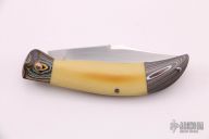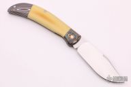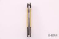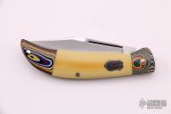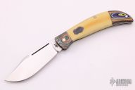 This Slipjoint by Dr. T features a clip point blade with a hand-rubbed satin finish and nail nick. The handle has Corvette Fordite bolsters, Westinghouse paper micarta covers with Corvette Fordite escutcheon, stainless steel liners and spring. Comes with a leather sheath. Has a couple light scratches, otherwise excellent condition.