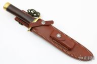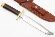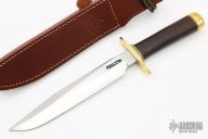 The Model 1-8 by Randall Made Knives has a brass guard, desert ironwood burl grip, brass butt cap, black/brass spacers. Satin finished blade with sharpened top edge, .234" blade stock and 1.208" blade depth, hidden tang construction. Comes with a brown leather sheath. Excellent condition.