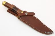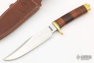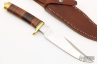 This "Nordic Knives Special Bowie" was made by Randall and originally sold by Nordic Knives. It has a satin finished full flat ground blade with .215" blade thickness and 1.290" blade depth, sharpened top edge, hidden tang construction. The handle has a brass guard and butt, stacked leather grip with black and brass spacers. #756 on back side of blade. Comes with a brown leather sheath. Excellent condition.