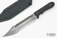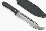 This Recon2 by Zu Bladeworx features an "Antiqued" blade with fullers, notched thumbrest, and bone breaker spine, .223" blade stock and 1.570" blade depth, full tang construction. The handle has black G-10 scales with red liners. Comes with a kydex sheath. Excellent condition.