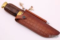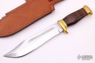This Walkabout by Down Under Knives features a mirror polished clip point blade with false top edge, fullers, .248" blade stock and 1.747" blade depth, hidden tang construction. The handle has a brass guard and butt with stacked leather grip. Comes with a brown leather sheath and original box. Excellent condition.