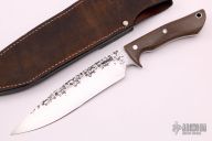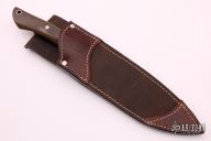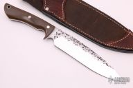 This Ranger by Lon Humphrey features a satin finished blade with hammer marked flats, .189" blade stock and 1.533" blade depth, full tang construction with green canvas micarta scales. Comes with a brown leather sheath and original box. Excellent condition.